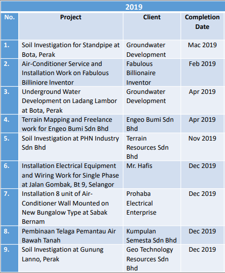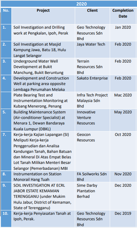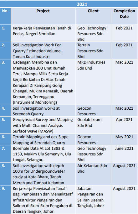 - Kerja-Kerja Penyiasatan Tanah Dan Pengujian Makmal Bagi Projek Cadangan Pembinaan Ruang Tambahan, Pemasangan Landasan Dan Stesen Platform Di UNIKL MFI Bangi, Selangor (2021)